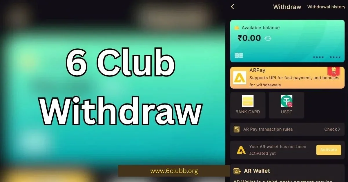 You can use Bank Card, UPI, USDT, or ARPay payment gateways for transferring your payout from your wallet. With a user-friendly withdrawal limit, you can use UPI to transfer with a minimum of ₹500.00 to a maximum of ₹500000.00, while for USDT it is ₹1000.00 to ₹1000000.00, and Bank Card allows you to withdraw from ₹110.00 to ₹200000.00. So, the 6 Club withdrawal options are flexible, fast, safe and secure.